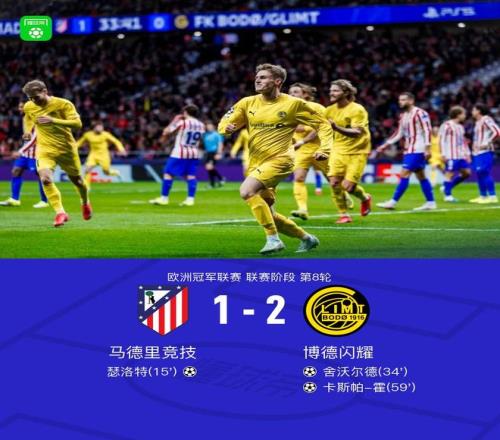 北京時(shí)間1月29日歐洲冠軍聯(lián)賽 聯(lián)賽階段 第8輪,馬德里競(jìng)技對(duì)陣博德閃耀。上半場(chǎng)巴埃納越位在先,頭球破門(mén)被吹無(wú)效,之后漢茨科送出助攻,瑟洛特?fù)岦c(diǎn)頭球破門(mén)先拔頭籌,布約爾坎助攻舍沃爾德破門(mén)將比分扳平。下半場(chǎng)卡斯帕-霍門(mén)前混戰(zhàn)中搶射破門(mén)將比分逆轉(zhuǎn)。隨即全場(chǎng)戰(zhàn)罷,最終比分馬競(jìng) 1-2 博德閃耀。